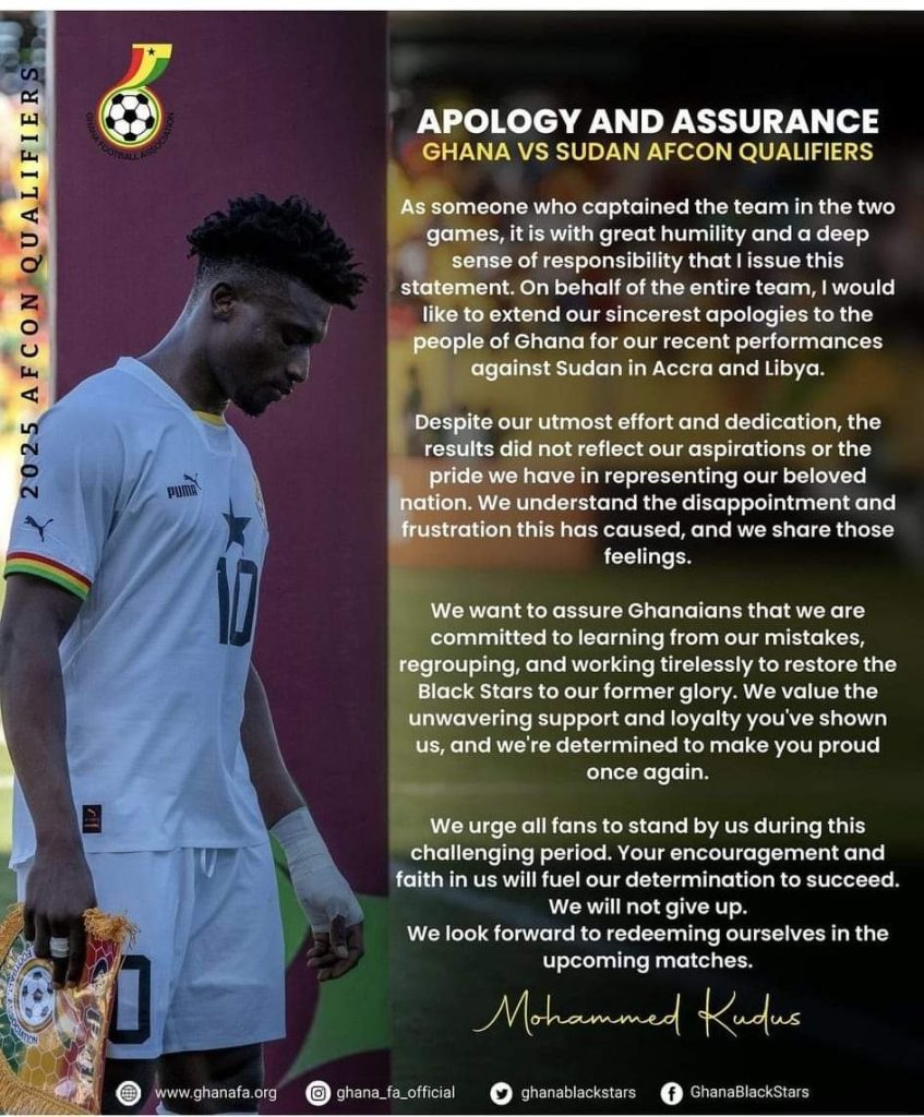 Black Stars captain Mohammed Kudus has penned an apology to Ghanaians in the wake of a string of disappointing results Ghana’s Men’s National Football Team has recorded recently.