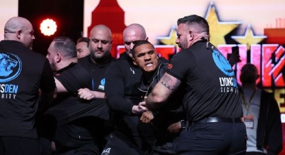 The face-off followed a heated news conference to launch their boxing match, which takes place April 26 in London.