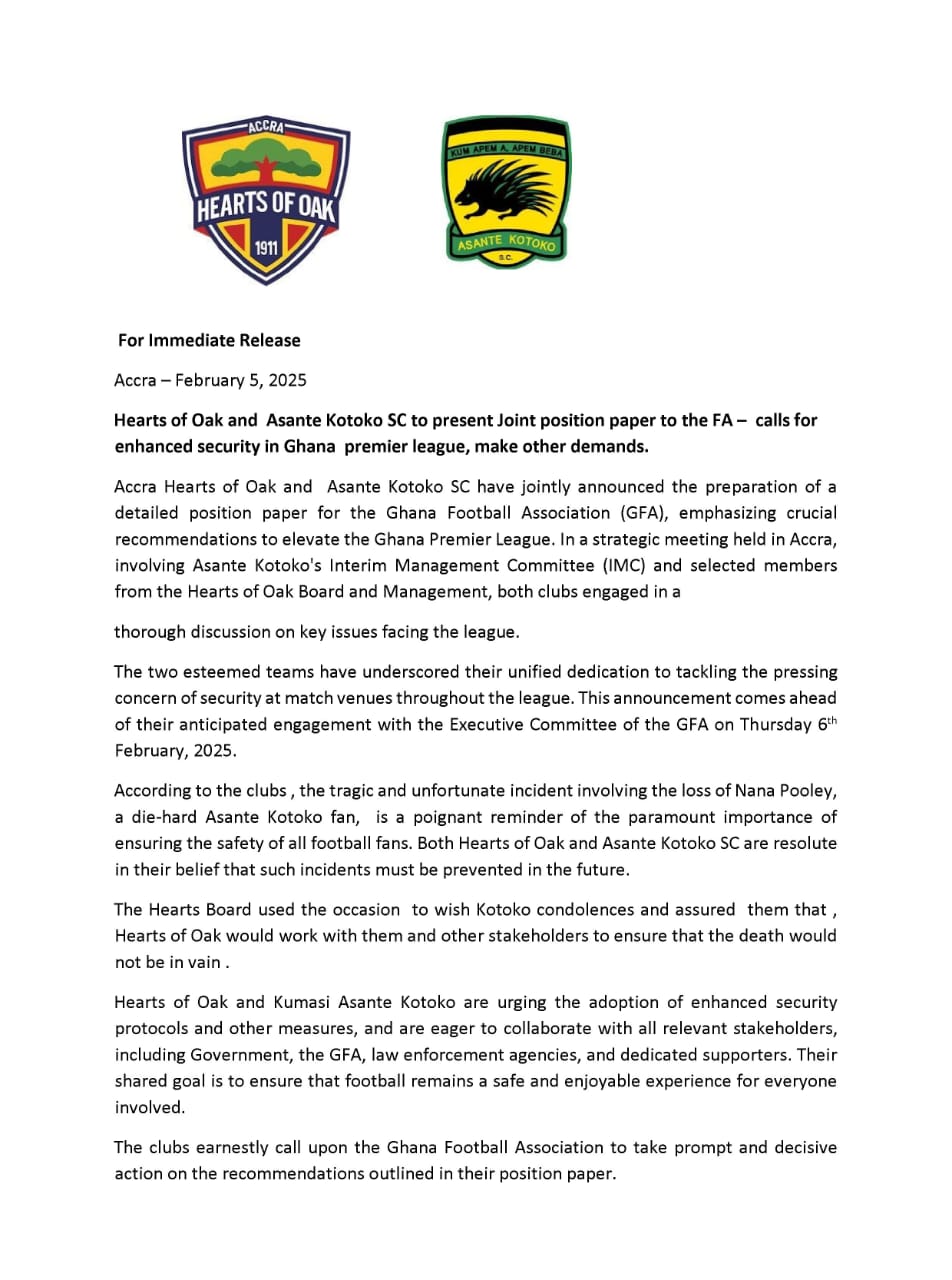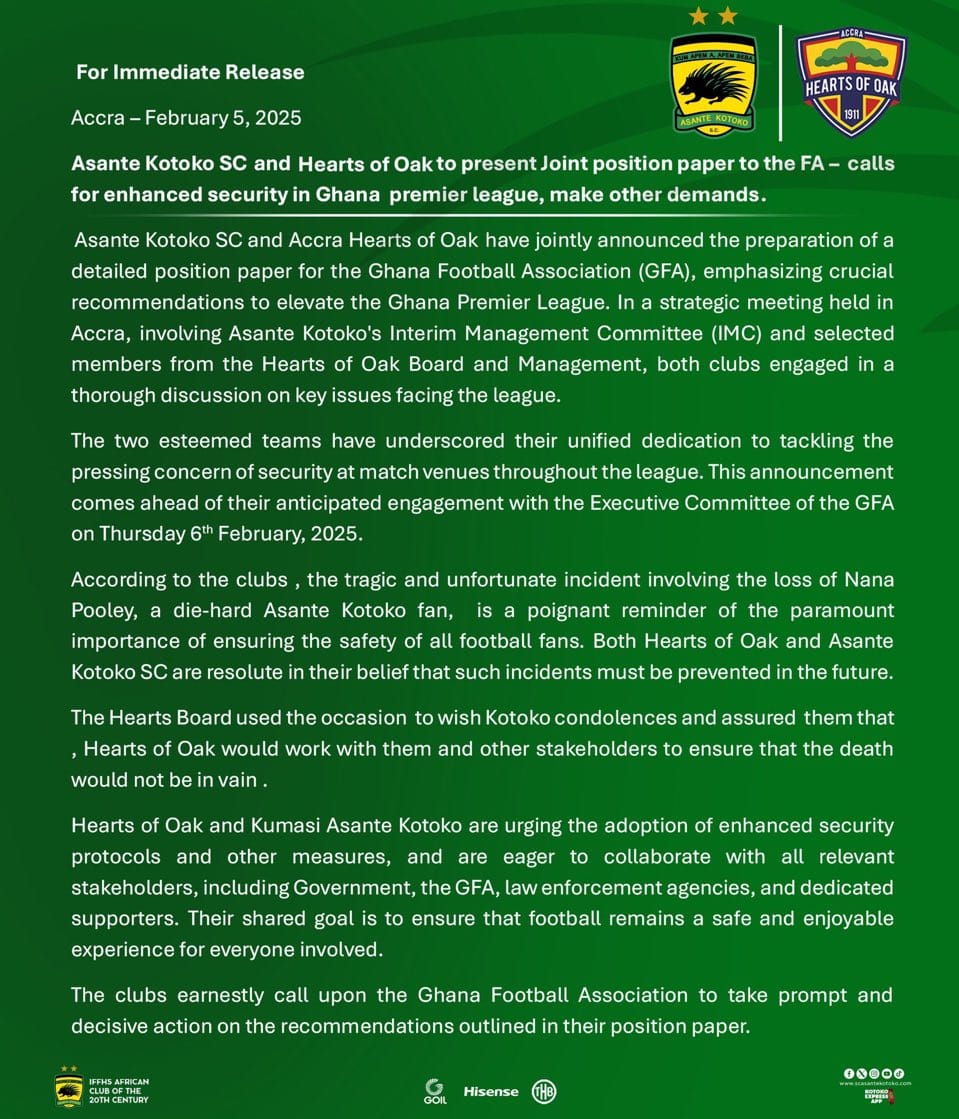 The two clubs have jointly prepared a statement for the Ghana Football Association (GFA), calling for urgent reforms to ensure the safety of players, officials, and fans.