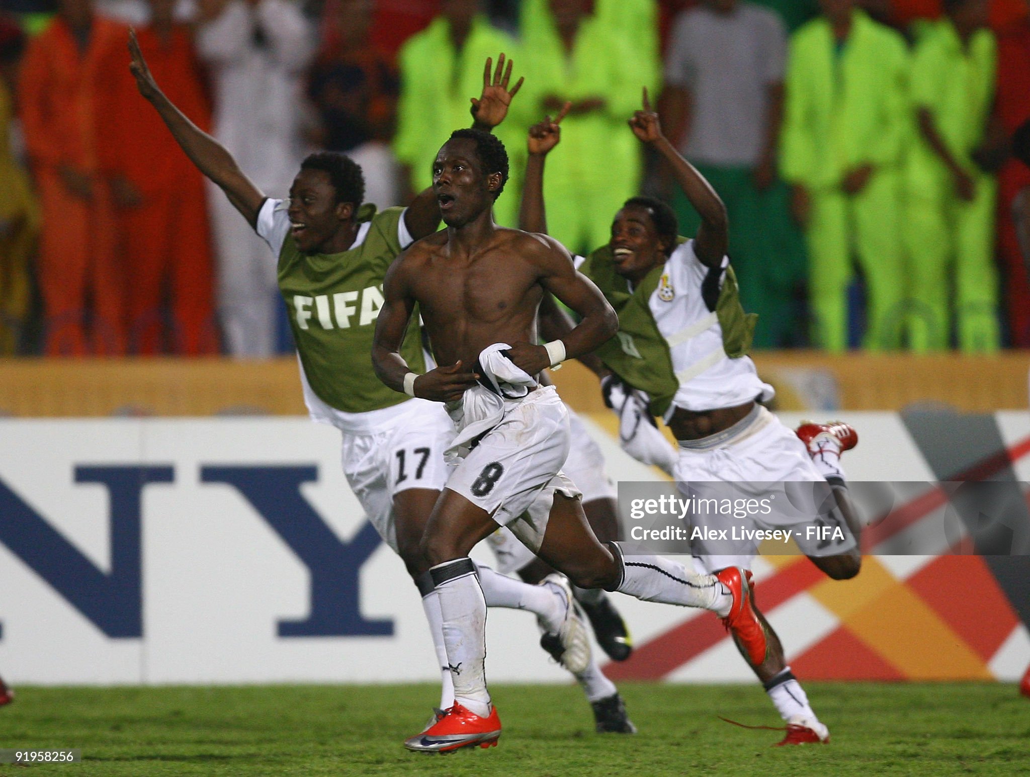 Emmanuel Agyemang-Badu of Ghana (8) celebrates after scoring the winning penalty during a penalty shoot out against Brazil in the FIFA U20 World Cup Final between Ghana and Brazil at the Cairo International Stadium on October 16, 2009 in Cairo, Egypt. (Photo by Alex Livesey – FIFA/FIFA via Getty Images)