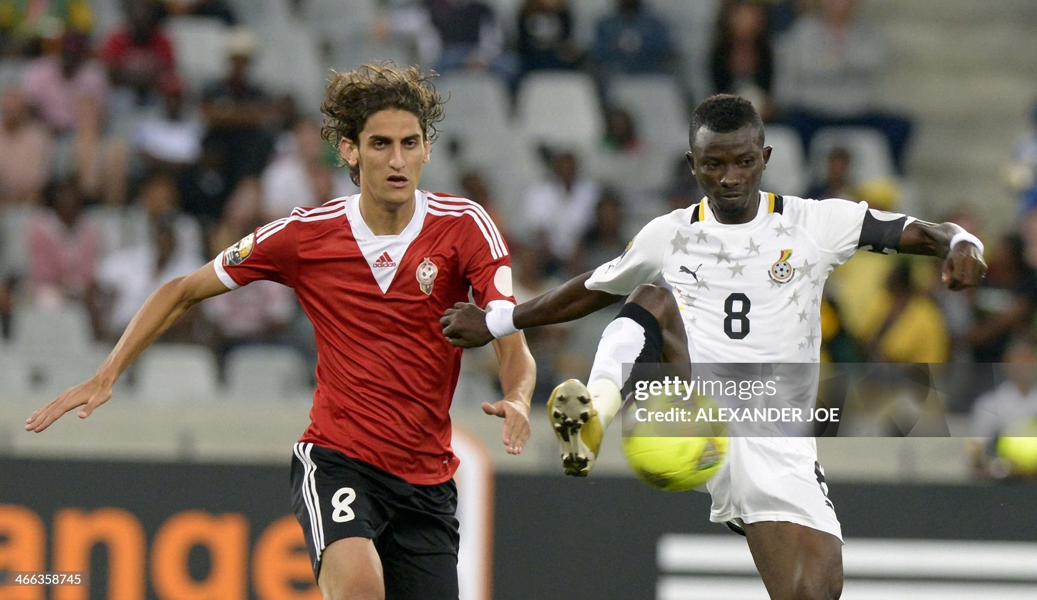 Jordan Opoku controls the ball next to Libya’s forward Mohamed Elgadi during the African Nations Championship final football match AFP PHOTO / ALEXANDER JOE (Photo credit should read ALEXANDER JOE/AFP via Getty Images)