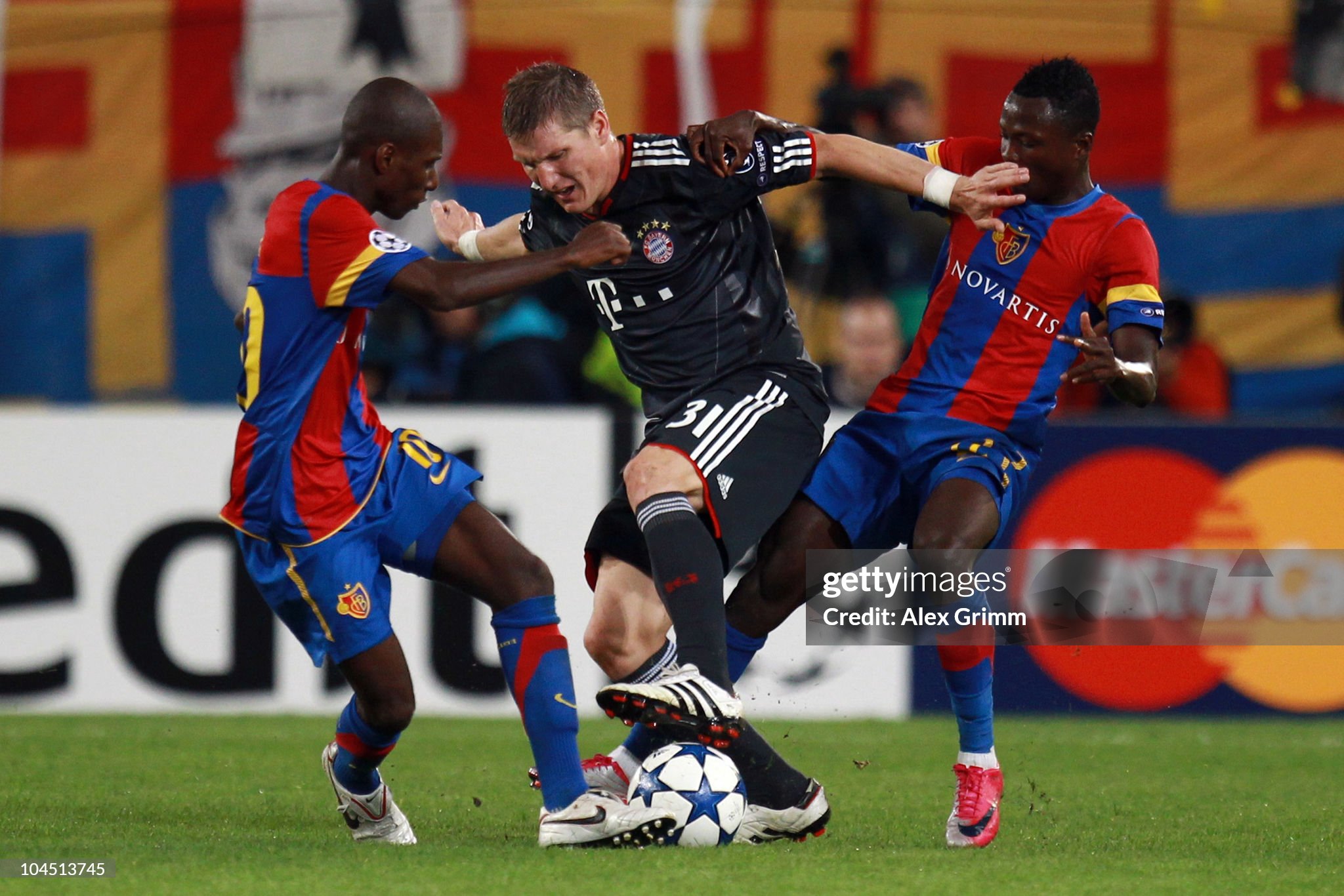 Bastian Schweinsteiger (C) of Muenchen is challenged by Gilles Yapi-Yapo (L) and Samuel Inkoom (R) of Basel during the UEFA Champions League group E match. (Photo by Alex Grimm/Bongarts/Getty Images)