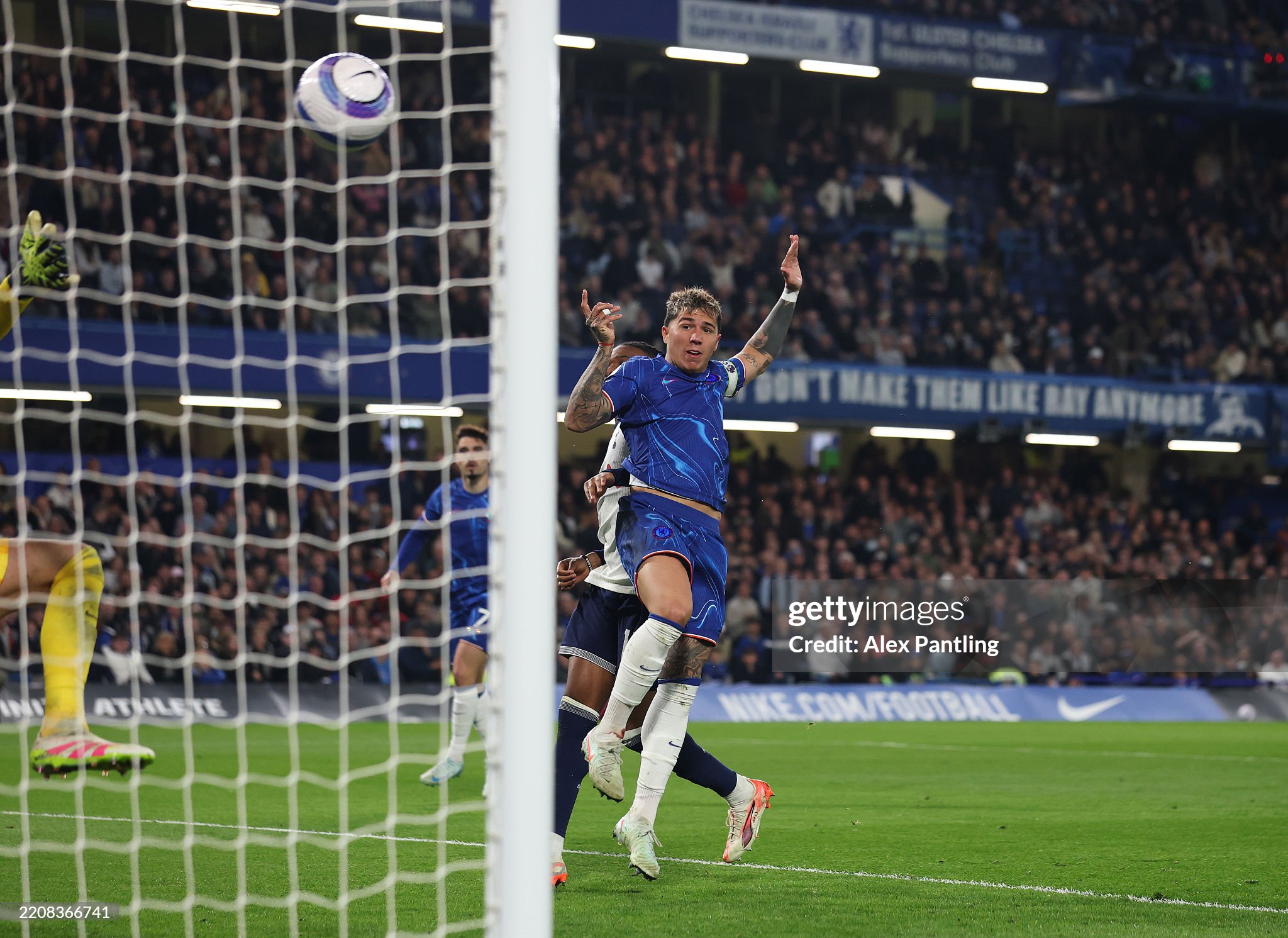 Enzo Fernandez of Chelsea heads the ball to score (Photo by Alex Pantling/Getty Images)