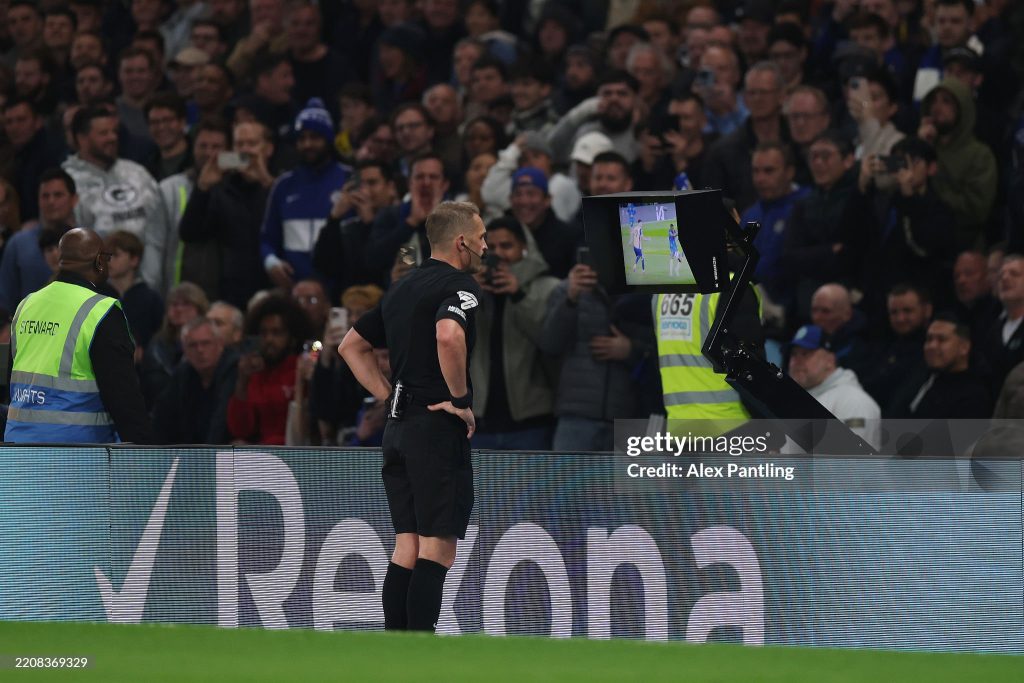 Match Referee Craig Pawson watches the pitch side VAR monitor before disallowing a goal scored by Pape Matar Sarr of Tottenham Hotspur (not pictured) (Photo by Alex Pantling/Getty Images)