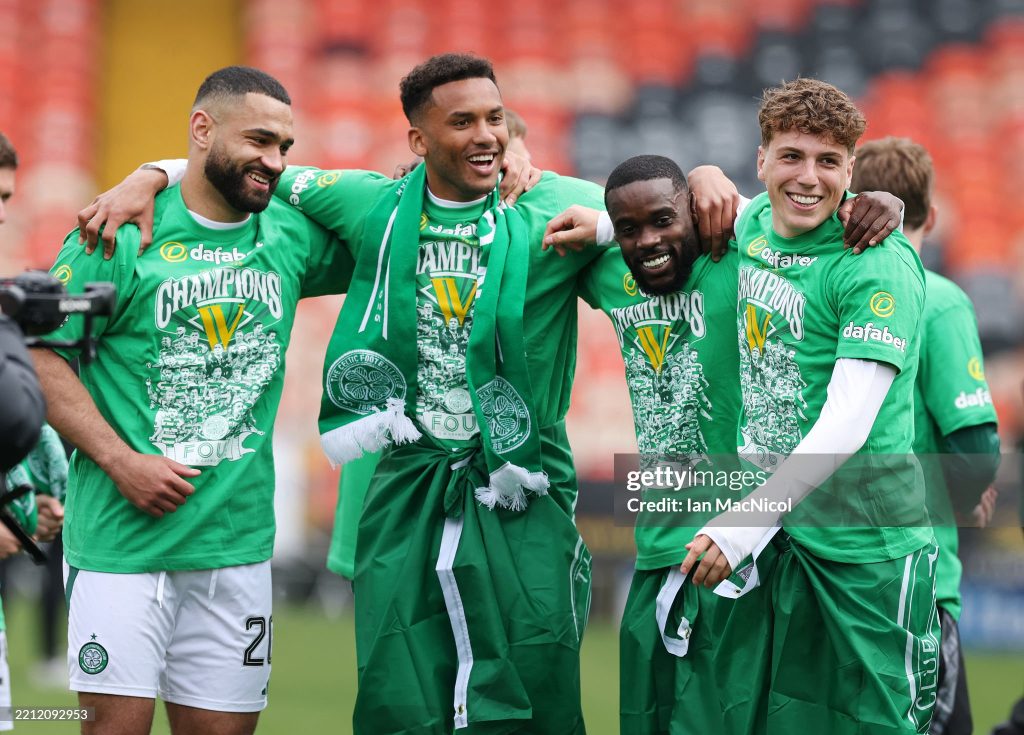Cameron Carter-Vickers, Auston Trusty, Jeffrey Schlupp and Arne Engels of Celtic are seen celebrating (Photo by Ian MacNicol/Getty Images)