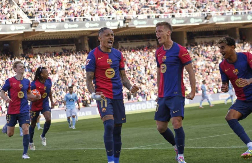 Raphinha scored a penalty in the eighth minute of injury time as La Liga leaders Barcelona completed a remarkable comeback to beat Celta Vigo 4-3.