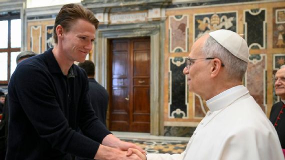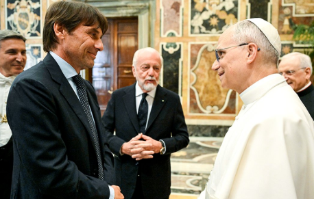 Coach Antonio Conte, whom De Laurentiis introduced as “deeply Catholic,” knelt down and kissed the Pope’s hand, before Leo told him he had seen him many times on TV.