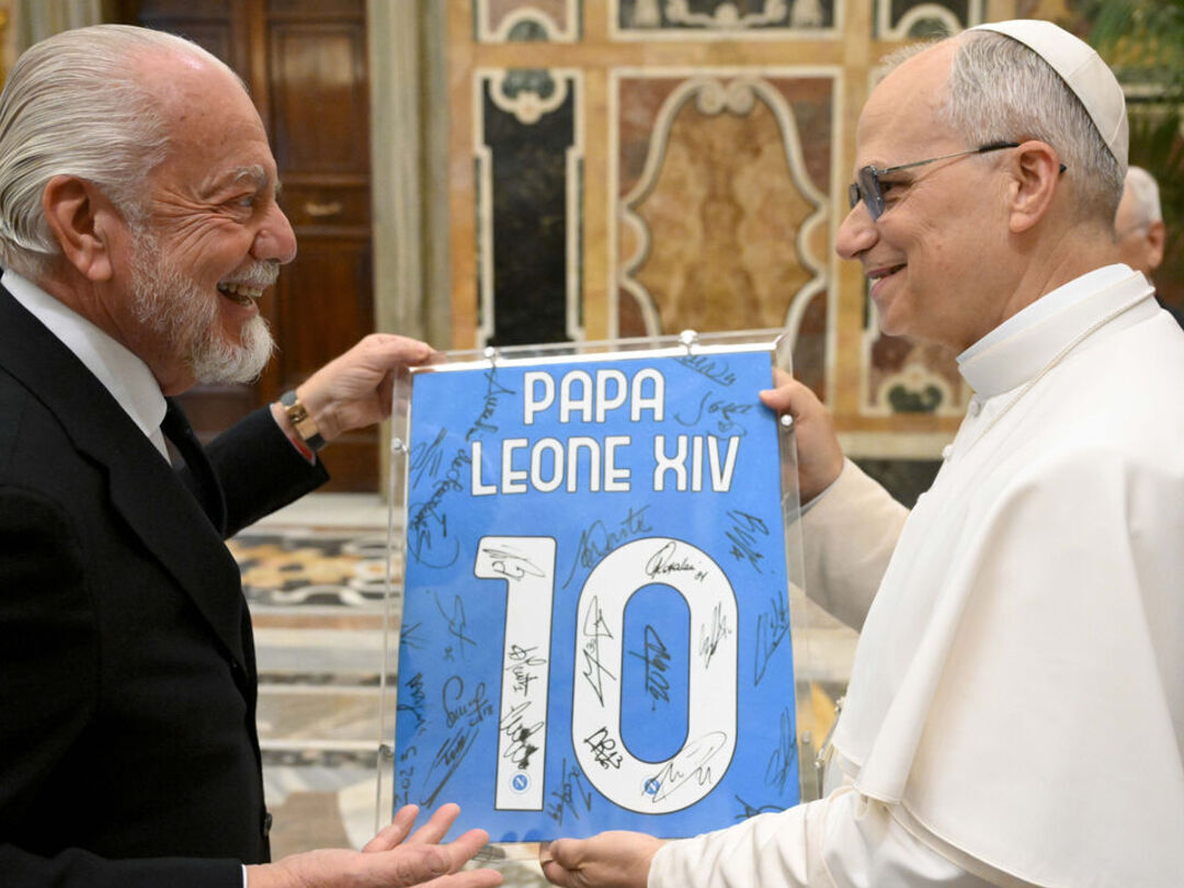 Napoli chairman Aurelio De Laurentiis gave him a blue Napoli jersey signed by players, bearing the No. 10 and his name in Italian, “Papa Leone XIV.”