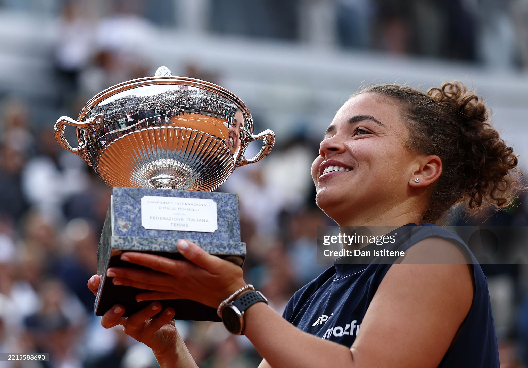 Jasmine Paolini of Italy poses for a photo with the trophy (Photo by Dan Istitene/Getty Images)