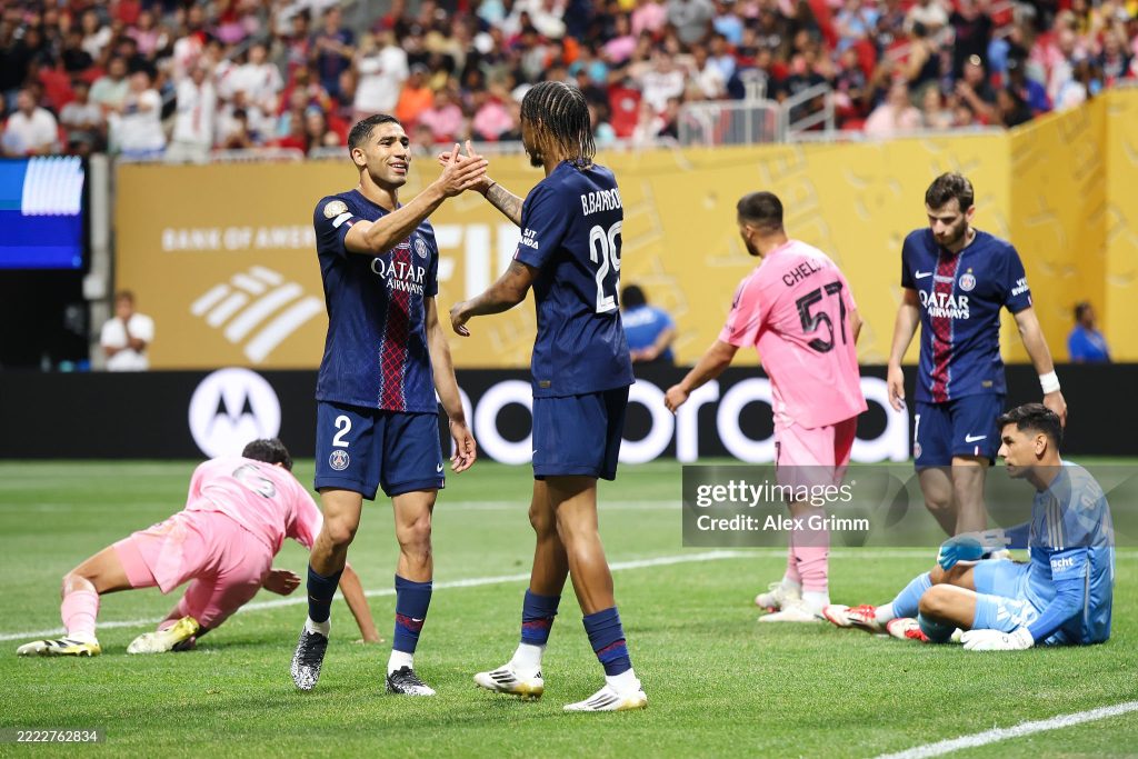Achraf Hakimi #2 of Paris Saint-Germain celebrates scoring his team’s fourth goal with Bradley Barcola #29 during the FIFA Club World Cup 2025 (Photo by Alex Grimm/Getty Images)