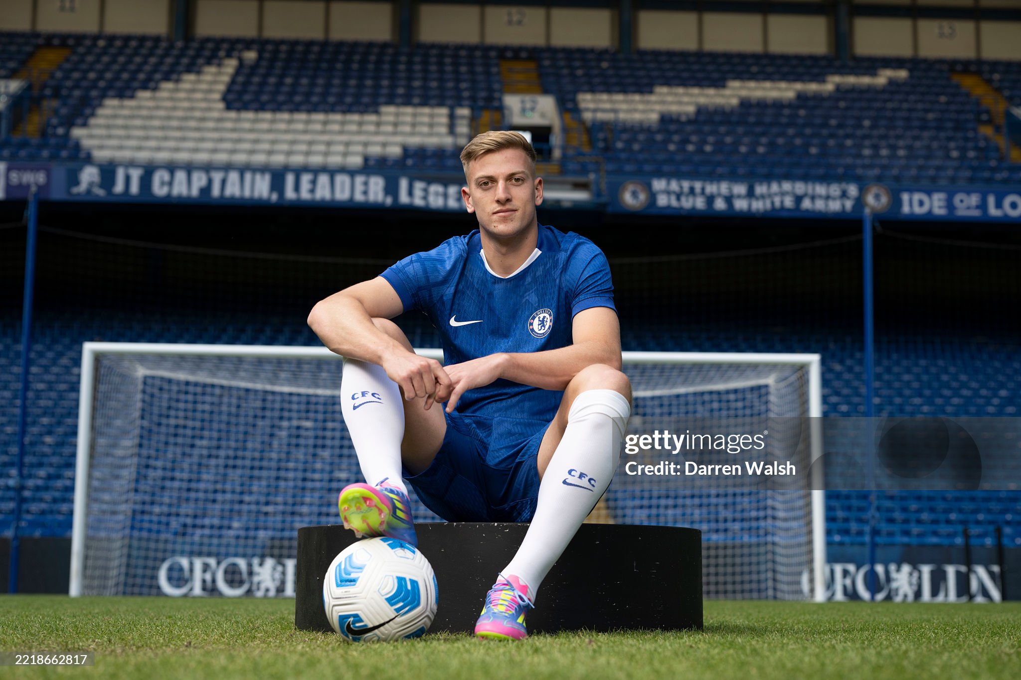 Liam Delap of Chelsea poses for a photo (Photo by Darren Walsh/Chelsea FC via Getty Images)