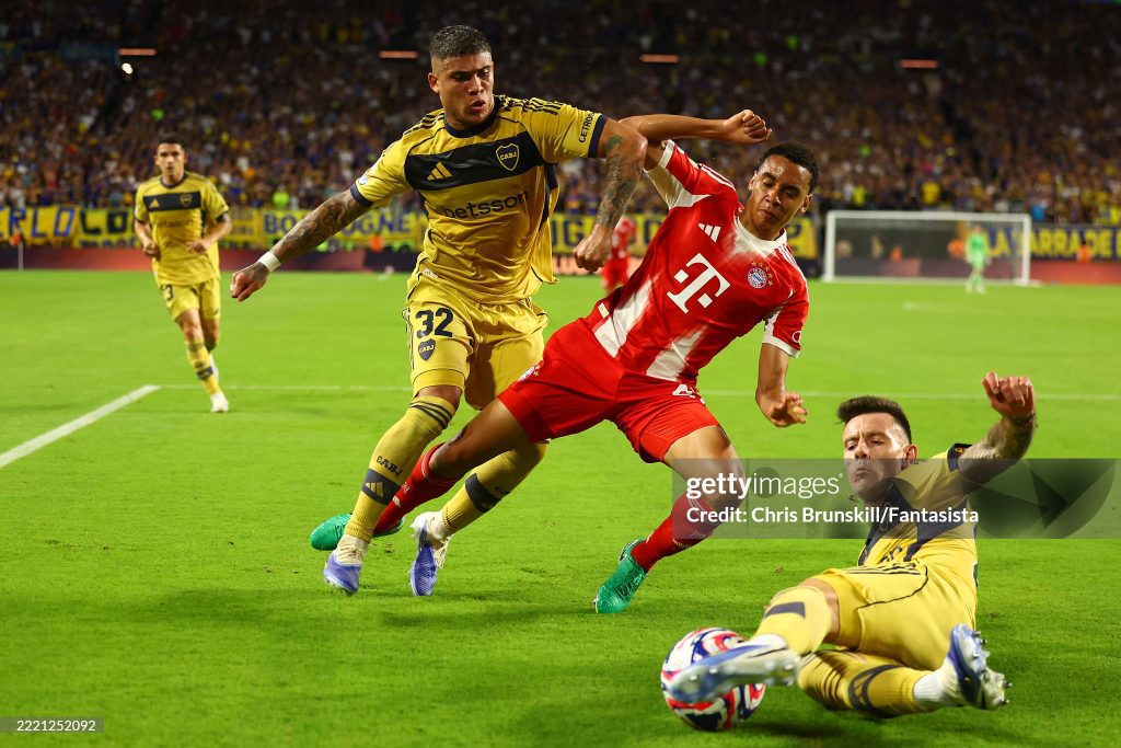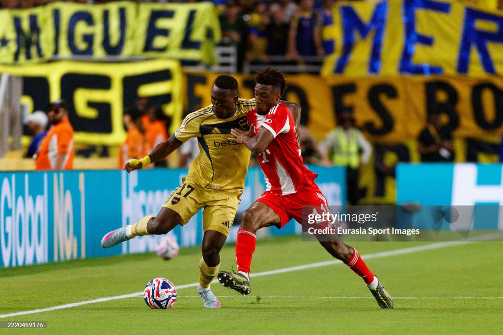 Kingsley Coman of FC Bayern Munchen (R) fights for the ball with Luis Advincula of CA Boca Juniors (L) during the FIFA Club World Cup 2025 (Photo by Martín Fonseca/Eurasia Sport Images/Getty Images)