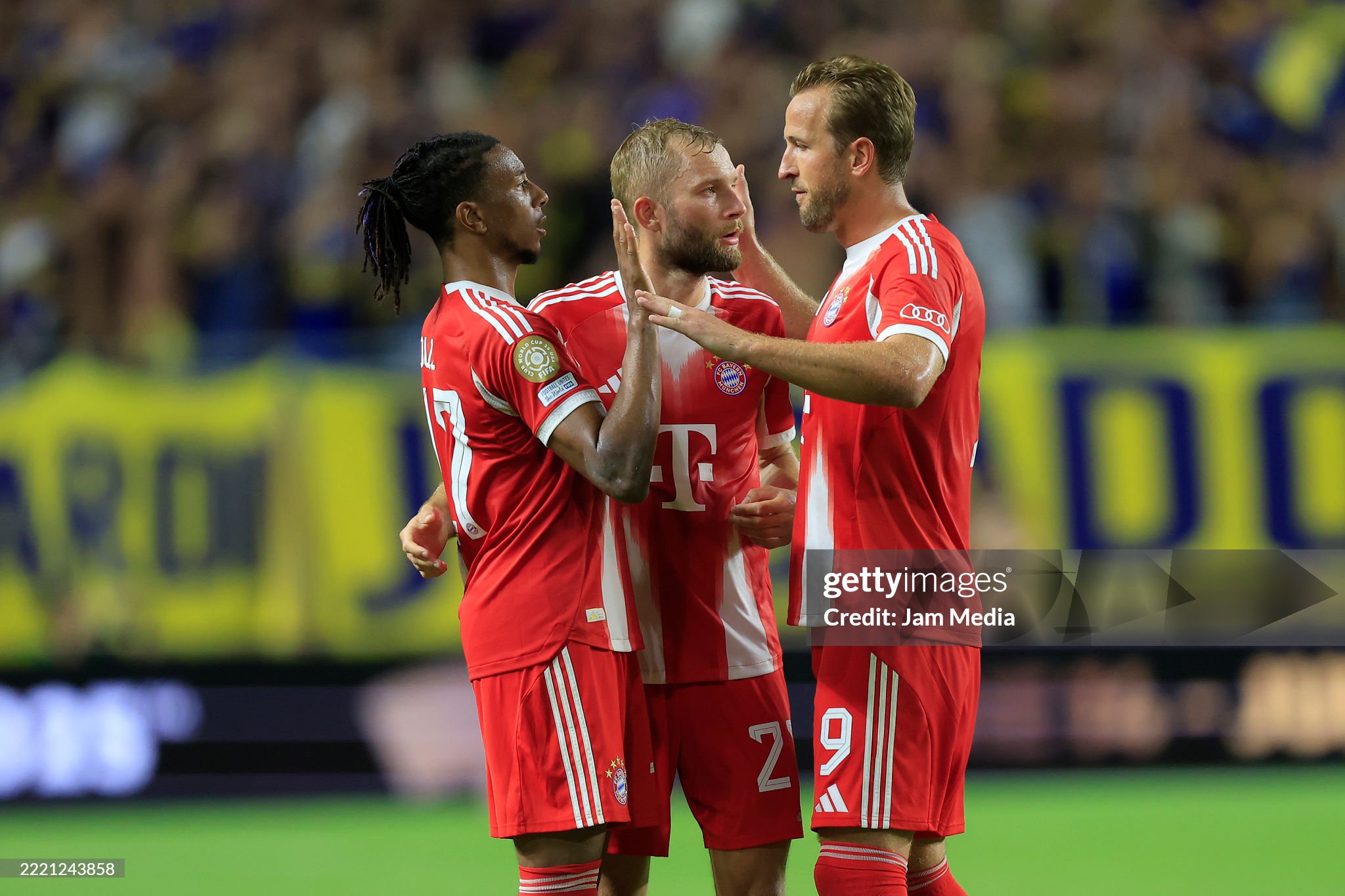 Michael Olise (L), Konrad Laimer (C) and Harry Kane (R) of FC Bayern Munchen celebrate after winning the FIFA Club World Cup 2025 (Photo by Hugo Rivera/Jam Media/Getty Images)