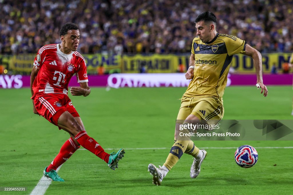 Jamal Musiala of FC Bayern Munchen (L) crosses the ball against Rodrigo Battaglia of CA Boca Juniors (R) during the FIFA Club World Cup 2025 (Photo by Qian Jun/Sports Press Photo/Getty Images)