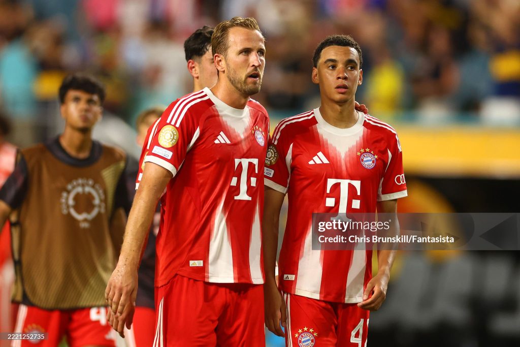 Jamal Musiala (R) of Bayern Munchen looks on next to team-mate Harry Kane during the FIFA Club World Cup 2025 (Photo by Chris Brunskill/Fantasista/Getty Images)