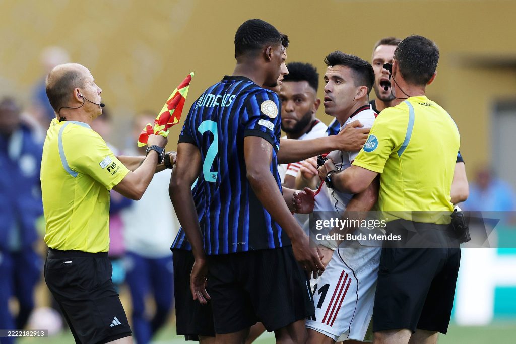 The bad-tempered match at Lumen Field in Seattle ended with River Plate’s Marcos Acuna having to be restrained by team-mates and staff – including his captain Franco Armani and Inter manager Cristian Chivu – as he chased opposition winger Denzel Dumfries who was jogging off the pitch.