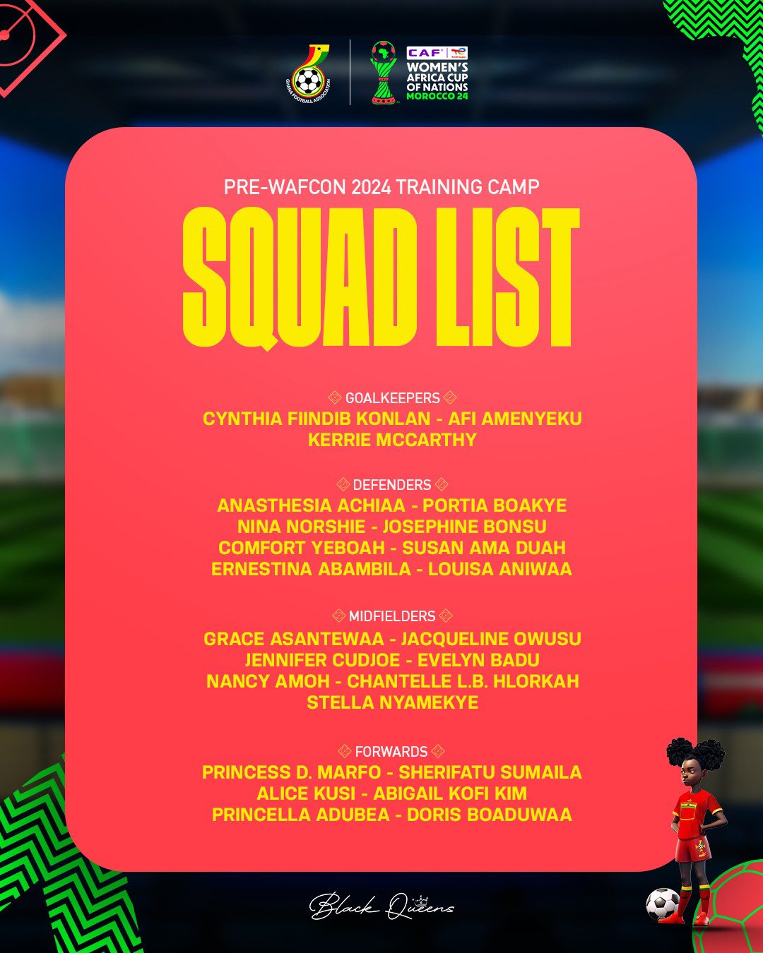 Our Pre-WAFCON training camp squad list is here..🔖#BlackQueens🇬🇭 | #WAFCON24 pic.twitter.com/9GcQlwdTCb