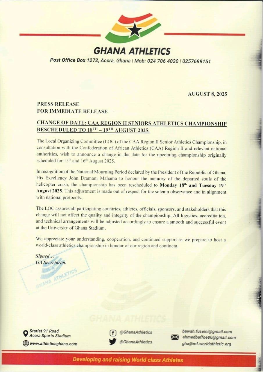 The highly anticipated CAA Region II Senior Athletics Championship has been rescheduled to Monday, 18 August, and Tuesday, 19 August 2025, following the declaration of a National Mourning Period by President John Dramani Mahama.