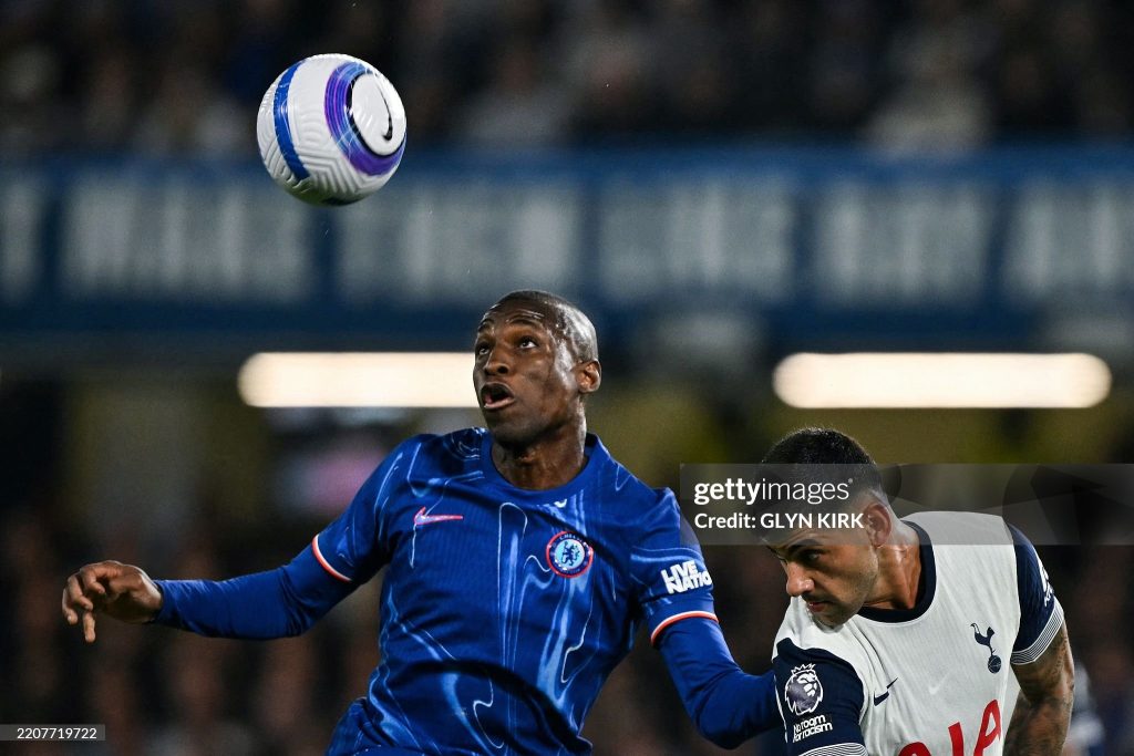 Chelsea’s Senegalese striker #15 Nicolas Jackson (L) fights for the ball with Tottenham Hotspur’s Argentinian defender #17 Cristian Romero (Photo by GLYN KIRK/AFP via Getty Images)