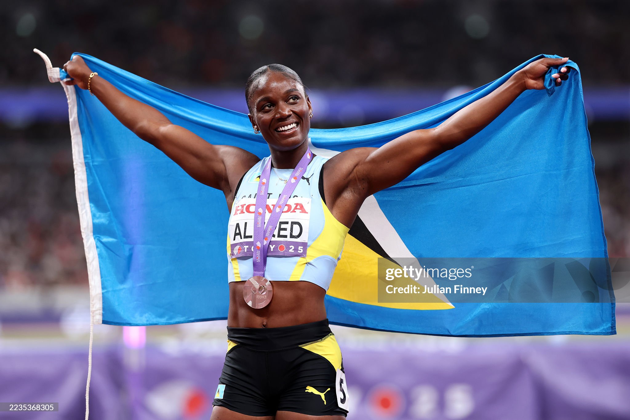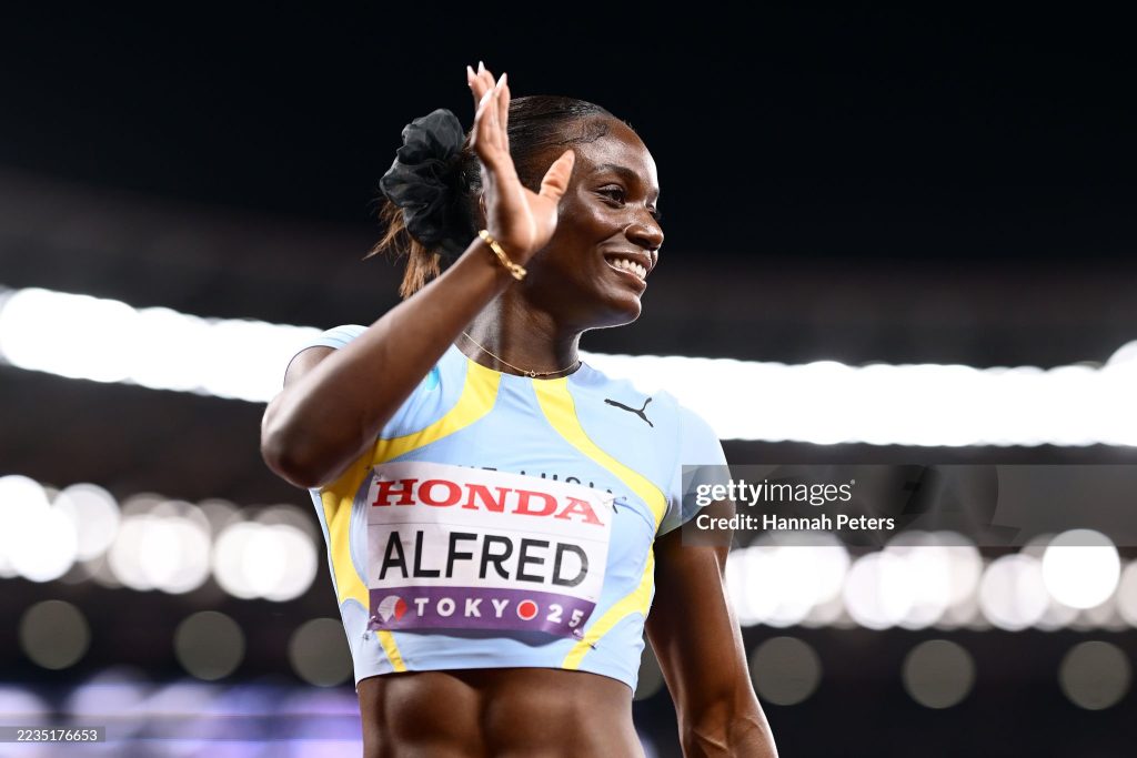 Julien Alfred of Team Saint Lucia waves prior to the Women’s 100 Metres Heats on day one of the World Athletics Championships Tokyo 2025 at National Stadium on September 13, 2025 in Tokyo, Japan. (Photo by Hannah Peters/Getty Images)