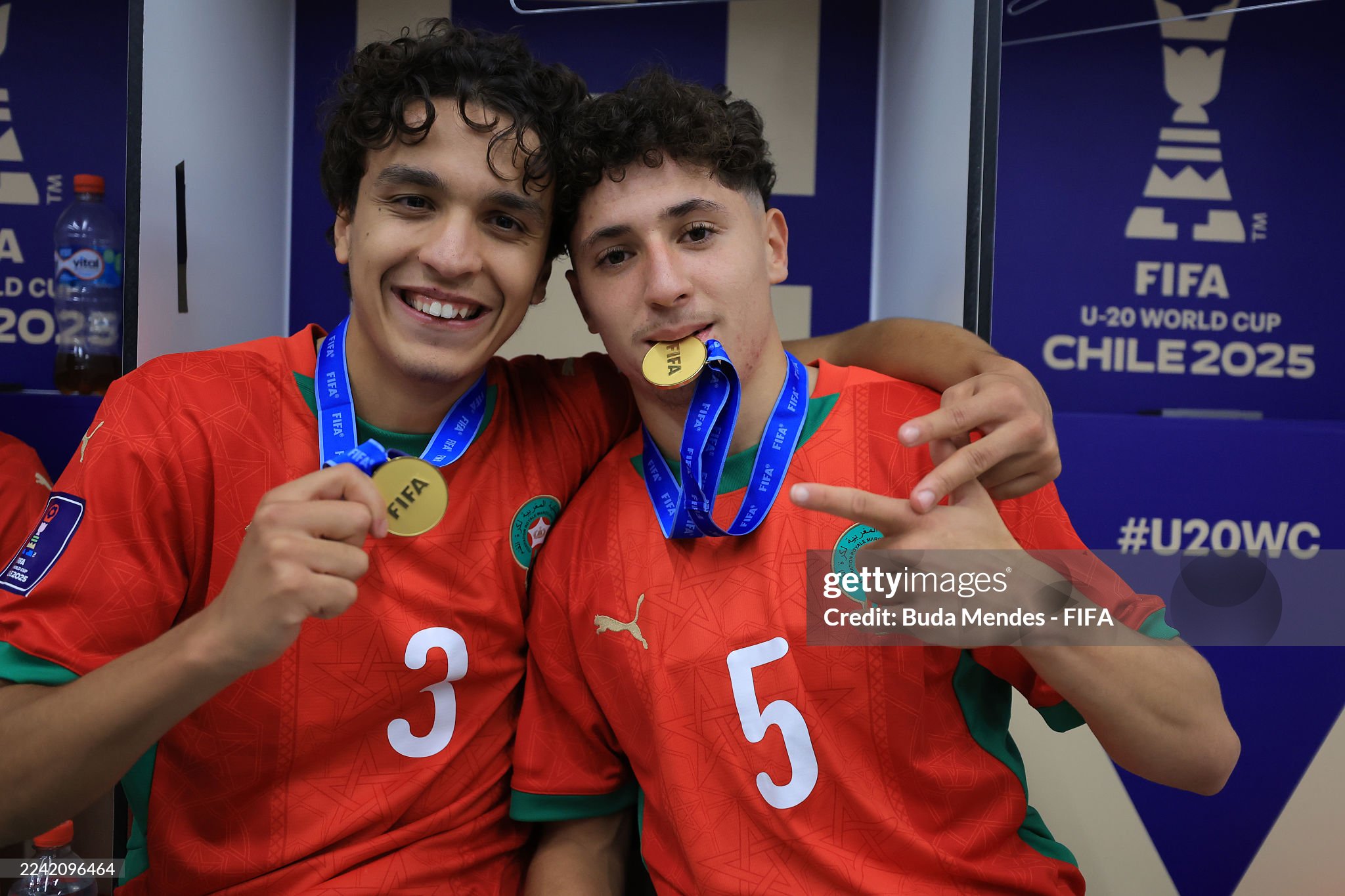 Ali Maamar and Anas Tajaouart of Morocco celebrate with the winner's medal after the FIFA U-20 World Cup Chile 2025 final match between Argentina and Morocco (Photo by Buda Mendes - FIFA/FIFA via Getty Images)