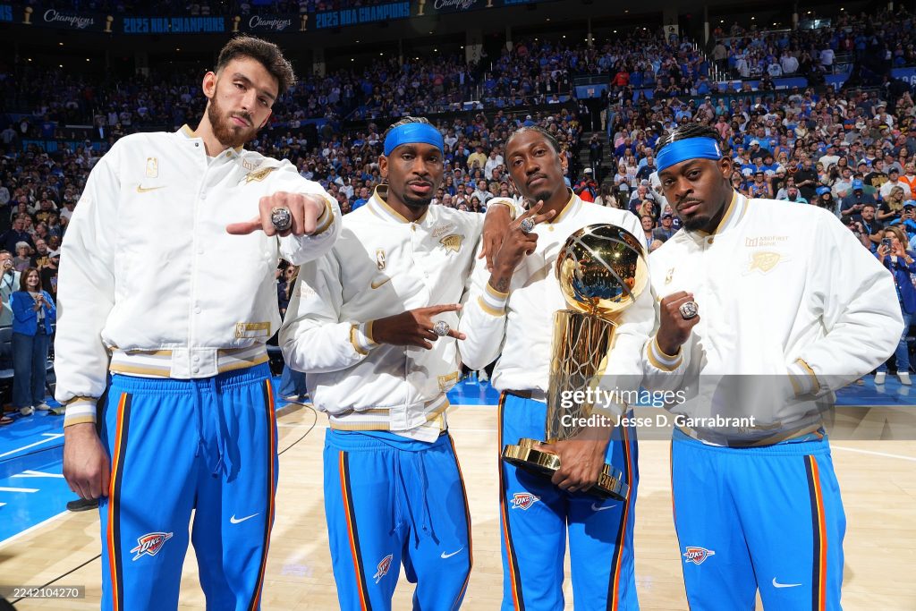 Oklahoma City Thunder players pose with their rings in front of the championship banner prior to the game against the Houston Rockets (Photo by William Purnell/Getty Images)