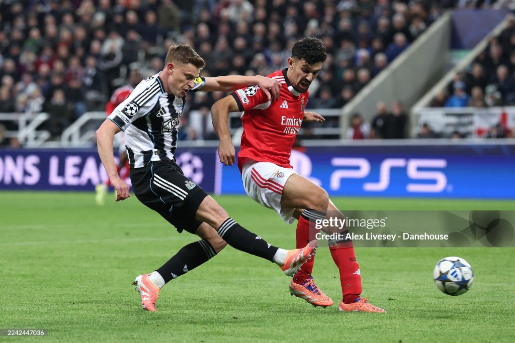 Harvey Barnes of Newcastle United scores their second goal during the UEFA Champions League 2025/26 League Phase MD3 match between Newcastle United FC and SL Benfica (Photo by Alex Livesey – Danehouse/Getty Images)