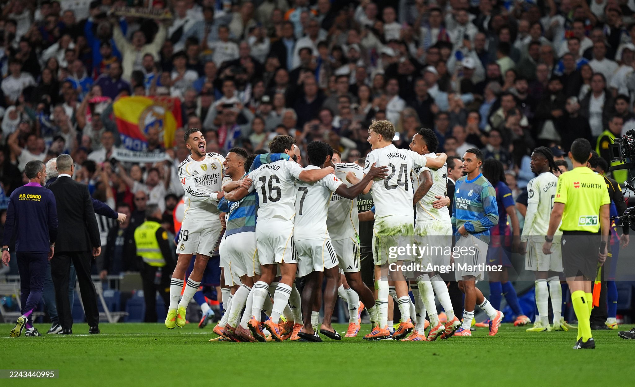 Players of Real Madrid celebrate after defeating FC Barcelona during the LaLiga EA Sports match between Real Madrid CF and FC Barcelona (Photo by Angel Martinez/Getty Images)