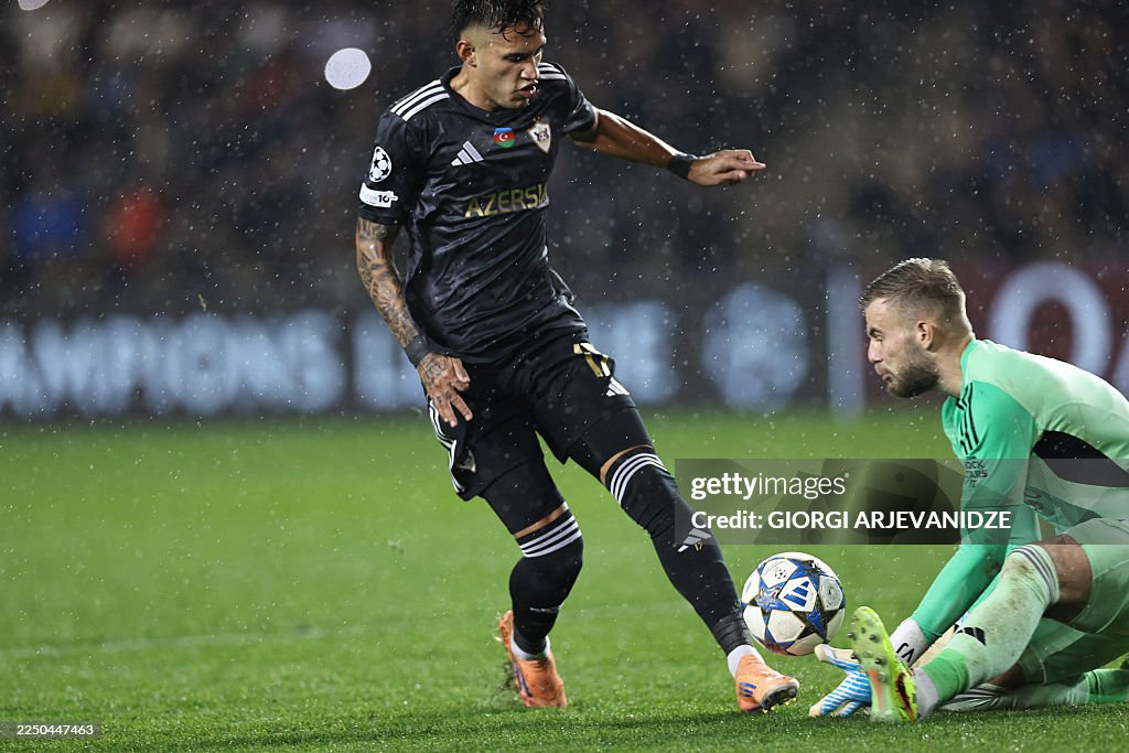 Qarabag’s Colombian forward Camilo Duran goalkeeper #01 Vitezslav Jaros vie for the ball. (Photo by Giorgi ARJEVANIDZE / AFP via Getty Images)