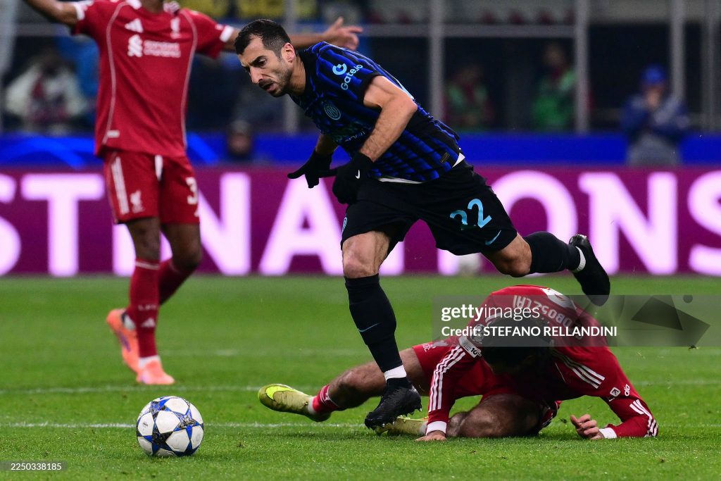 Liverpool’s Hungarian midfielder #08 Dominik Szoboszlai fights for the ball with Inter Milan’s Armenian forward #22 Henrikh Mkhitaryan during the UEFA Champions League phase day 6 football match between Inter Milan and Liverpool (Photo by Stefano RELLANDINI / AFP via Getty Images)