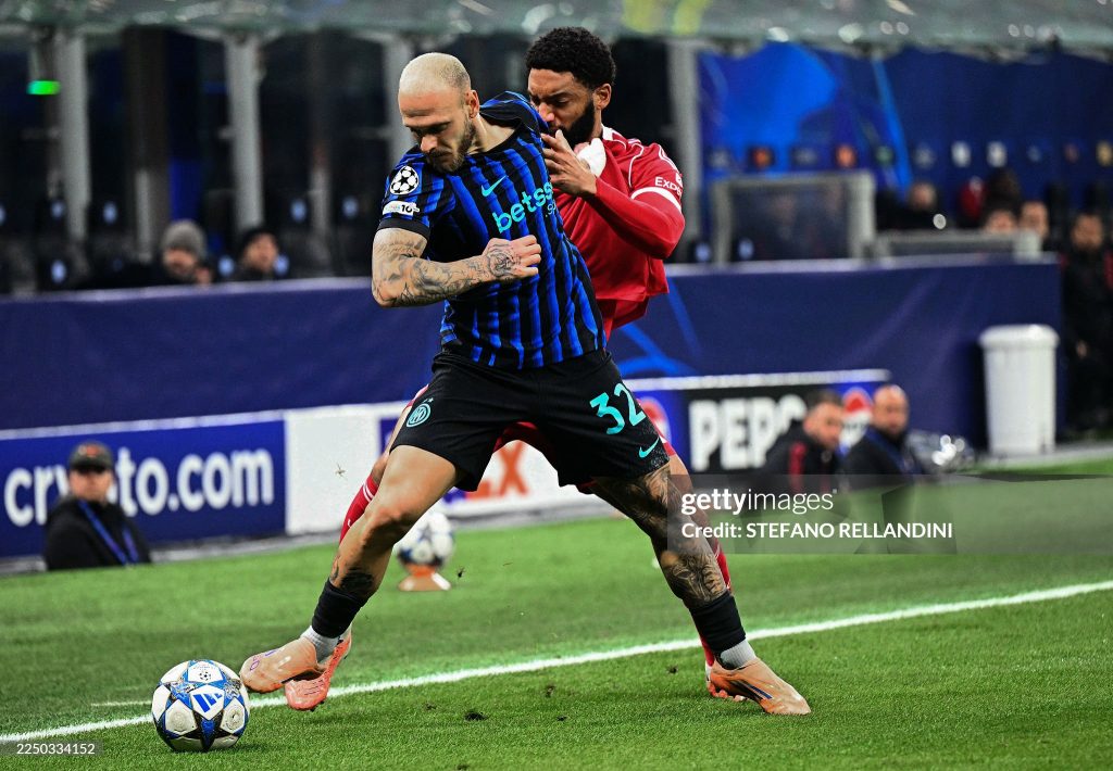 Inter Milan’s Italian defender #32 Federico Dimarco fights for the ball with Liverpool’s English defender #02 Joe Gomez during the UEFA Champions League phase day 6 football match between Inter Milan and Liverpool (Photo by Stefano RELLANDINI / AFP via Getty Images)