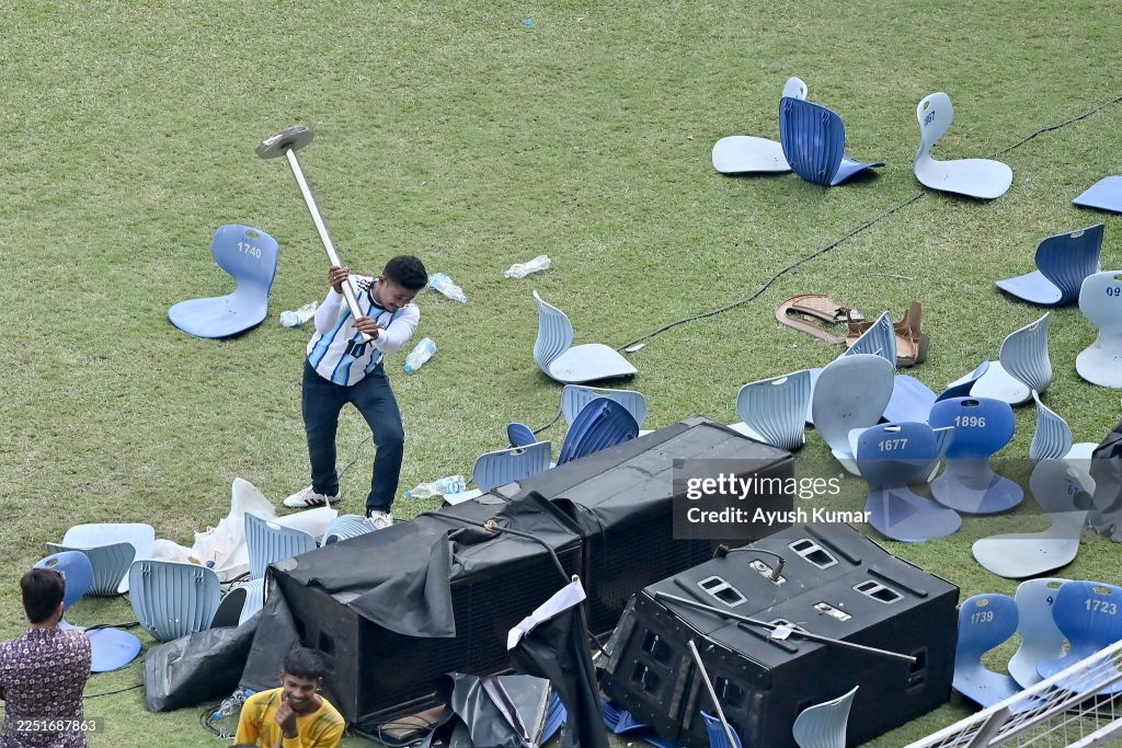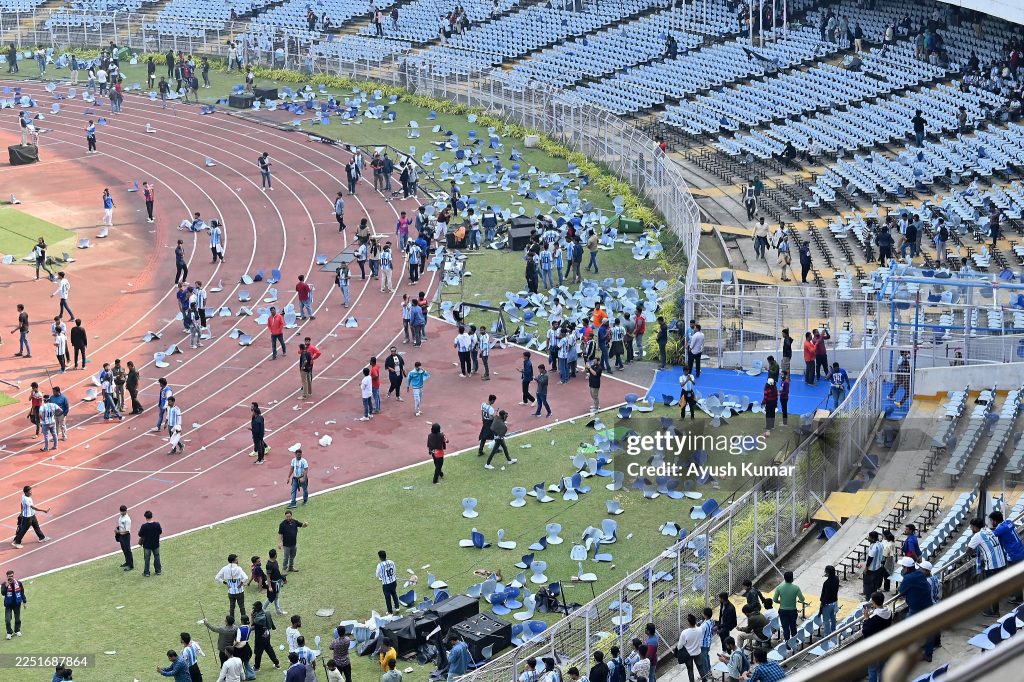 However, the Kolkata leg of his tour was cut short as chaotic scenes erupted after angry fans threw bottles and chairs on to the pitch at the Salt Lake Stadium for not being able to see Messi who was mobbed on the pitch by several guests.