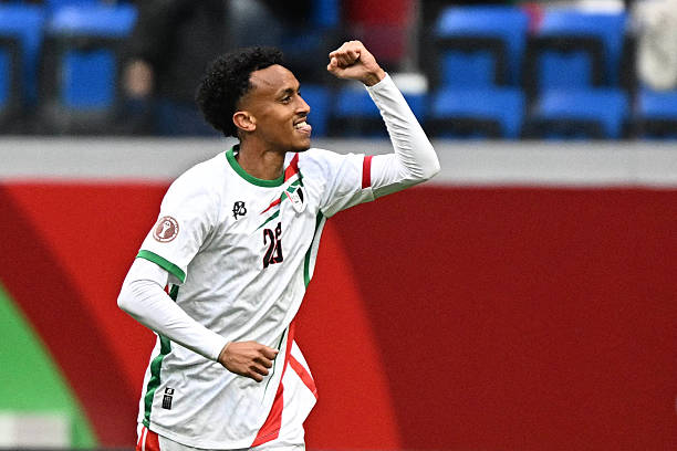 Sudan’s forward #26 Aamir Abdallah celebrates scoring his team’s first goal during the Africa Cup of Nations (CAN) round of 16 football match between Senegal and Sudan (Photo by Gabriel BOUYS / AFP via Getty Images)