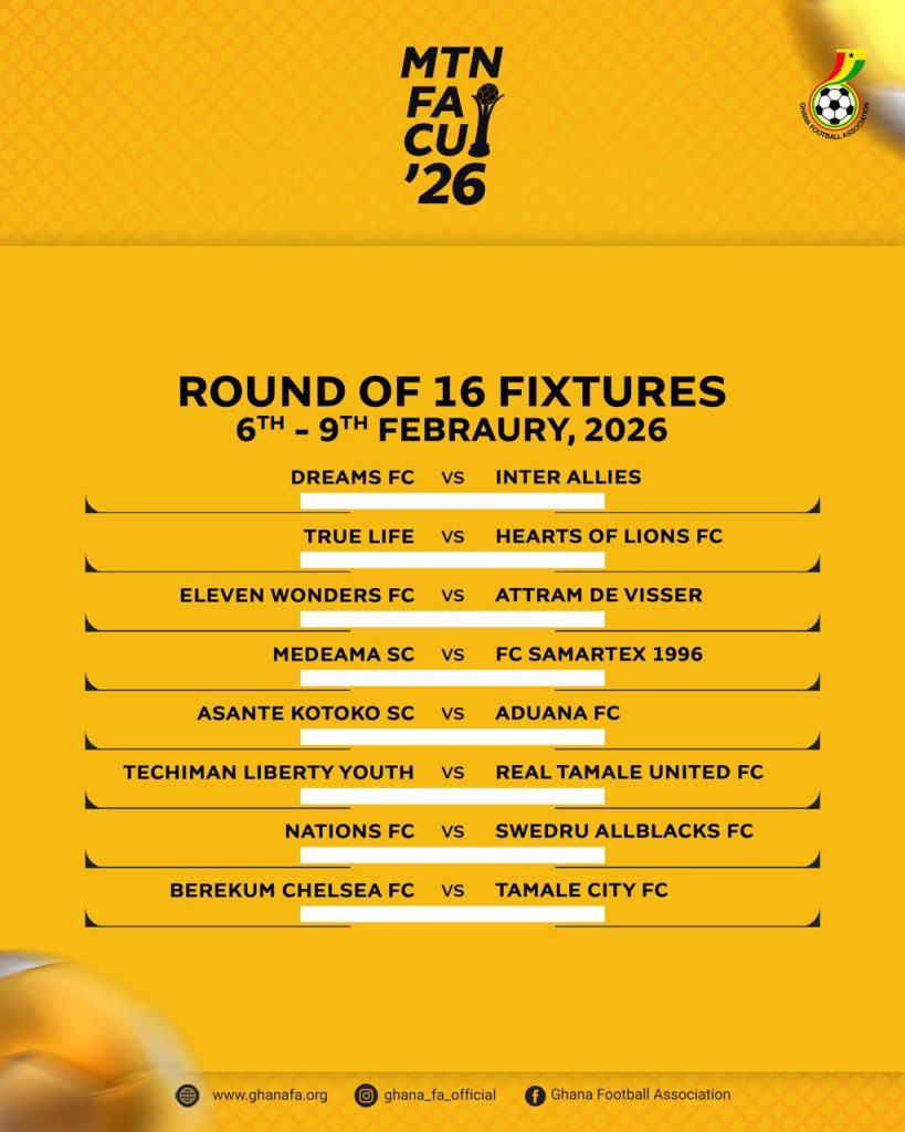 Matches in the Round of 16 are scheduled for the weekend of Friday, February 6 to Monday, February 9, 2026. Kumasi Asante Kotoko are the defending champions.