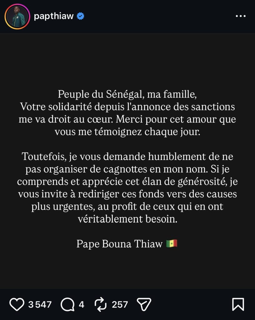 “However, I humbly ask you not to organize fundraising campaigns in my name. While I understand and appreciate this generosity, I encourage you to redirect those funds to more urgent causes, to help those who truly need them” Thiaw wrote on Instagram.