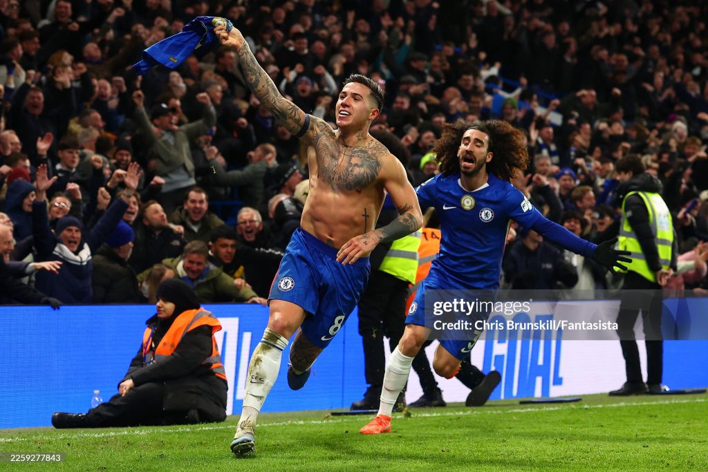 Enzo Fernandez (L) of Chelsea celebrates scoring his side’s third goal with team-mate Marc Cucurella during the Premier League match between Chelsea and West Ham United (Photo by Chris Brunskill/Fantasista/Getty Images)