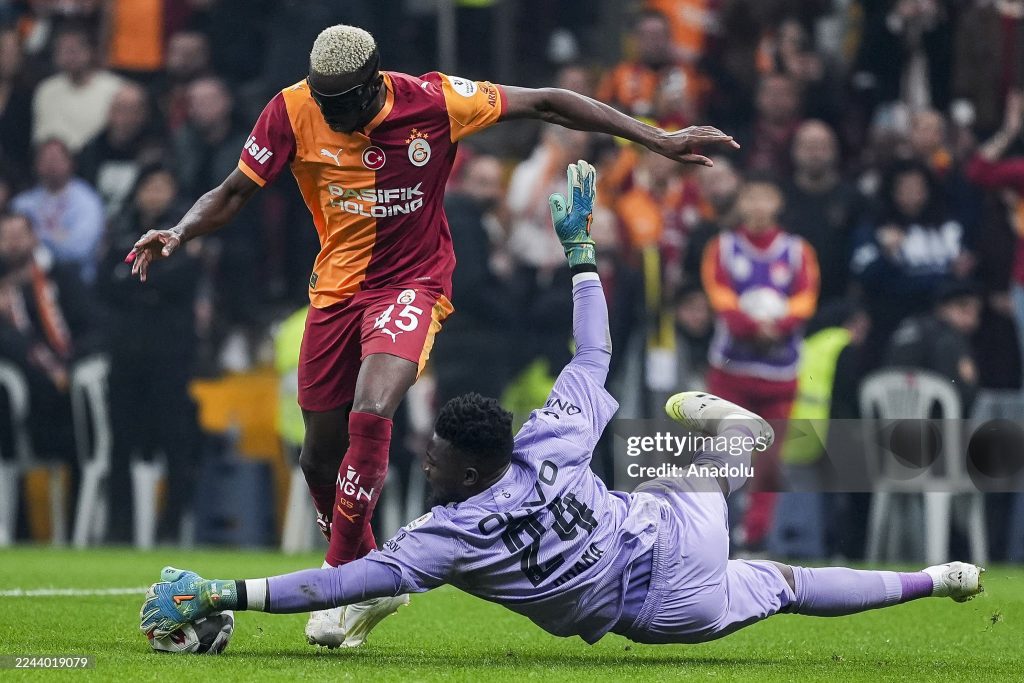 Victor Osimhen (L) of Galatasaray in action against Andre Onana (R) of Trabzonspor during the Turkish Super Lig week 11 football match between Galatasaray and Trabzonspor (Photo by Arife Karakum/Anadolu via Getty Images)