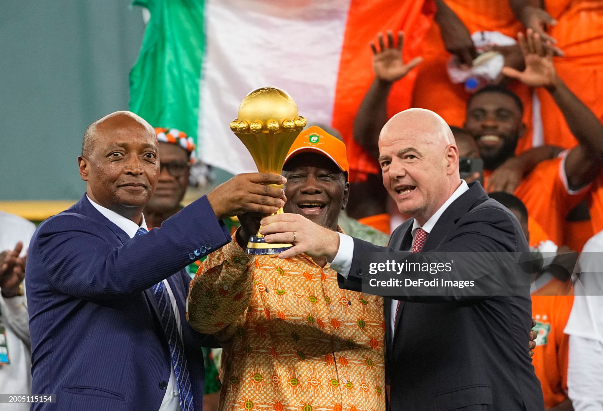 Giovanni Vincenzo Infantino, Alassane Dramane Ouattara and Patrice Motsepe looks on after the TotalEnergies CAF Africa Cup of Nations (Photo by Ulrik Pedersen/DeFodi Images via Getty Images)