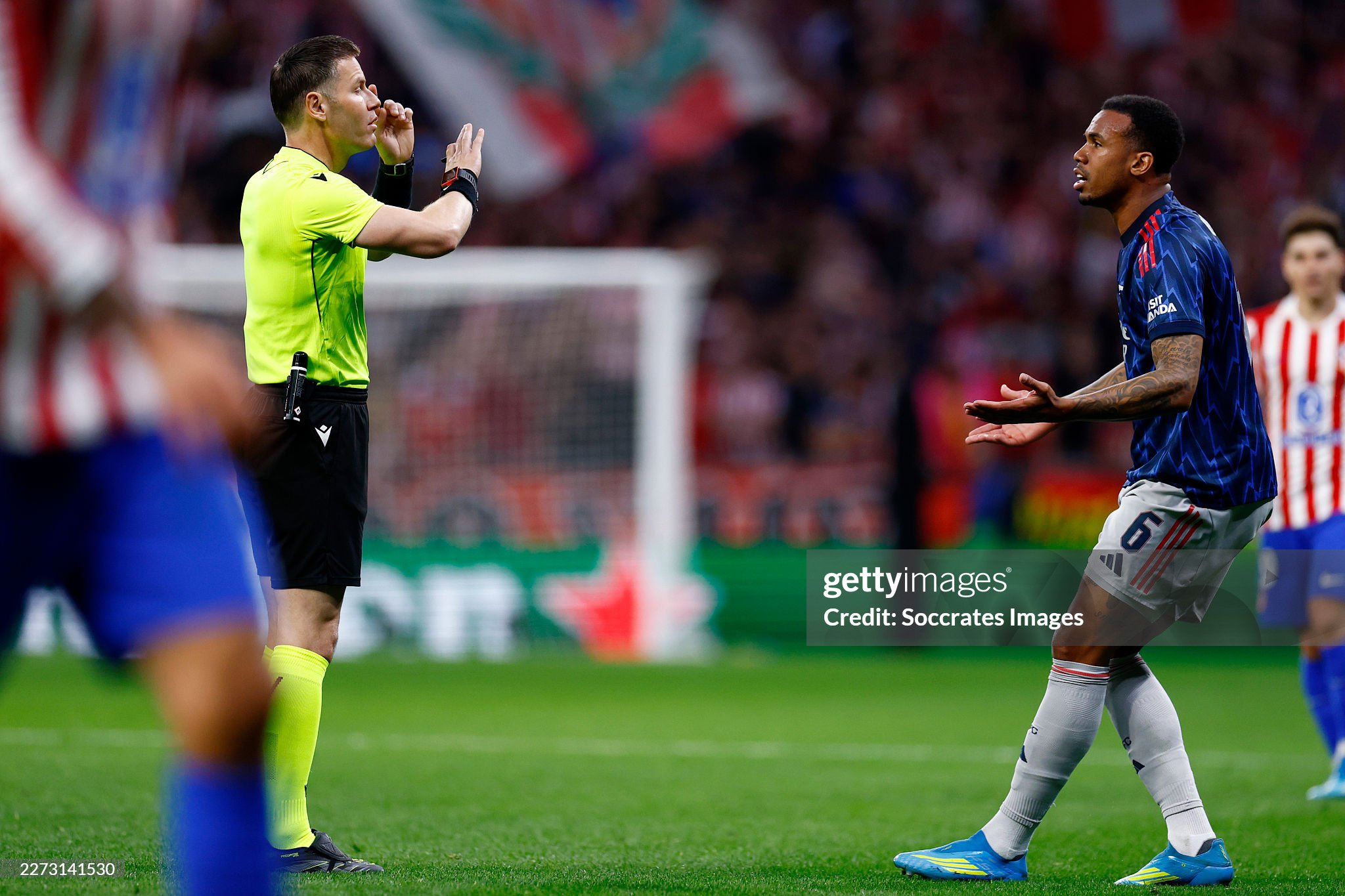 Referee Danny Makkelie argues with Gabriel of Arsenal during the UEFA Champions League match between Atletico Madrid v Arsenal (Photo by Maria Gracia Jimenez/Soccrates/Getty Images)
