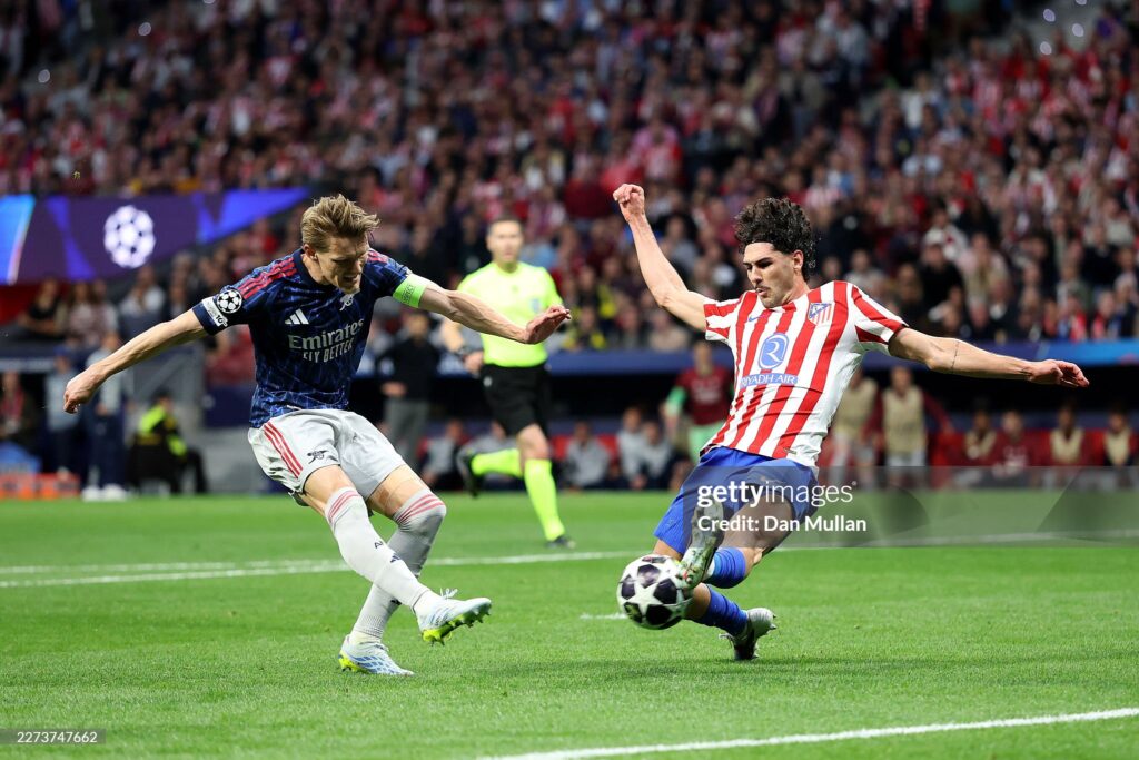 Martin Odegaard of Arsenal has a shot blocked by Johnny Cardoso of Atletico de Madrid during the UEFA Champions League 2025/26 Semi Final First Leg match between Atletico de Madrid and Arsenal FC (Photo by Dan Mullan/Getty Images)