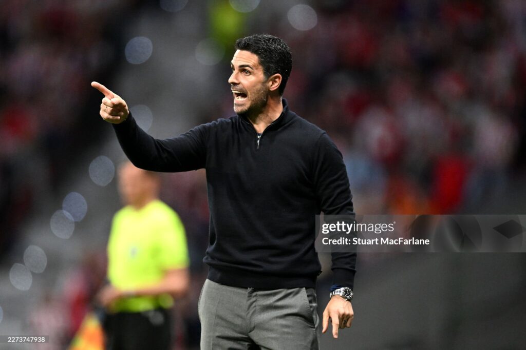 Mikel Arteta, Manager of Arsenal, reacts during the UEFA Champions League 2025/26 Semi Final First Leg match between Atletico de Madrid and Arsenal FC (Photo by Stuart MacFarlane/Arsenal FC via Getty Images)