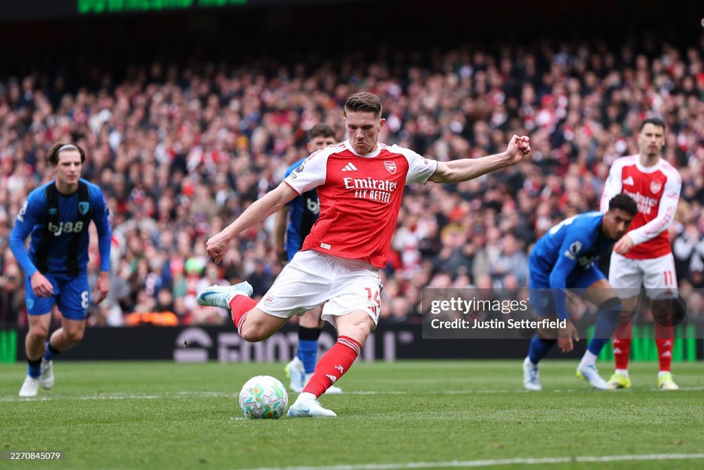 Viktor Gyoekeres of Arsenal scores his team’s first goal from the penalty spot during the Premier League match between Arsenal and Bournemouth (Photo by Justin Setterfield/Getty Images)