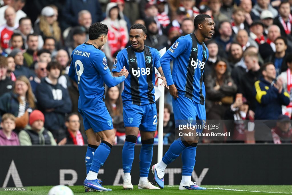 Eli Junior Kroupi of AFC Bournemouth celebrates scoring his team’s first goal with teammate Evanilson during the Premier League match between Arsenal and Bournemouth (Photo by Shaun Botterill/Getty Images)