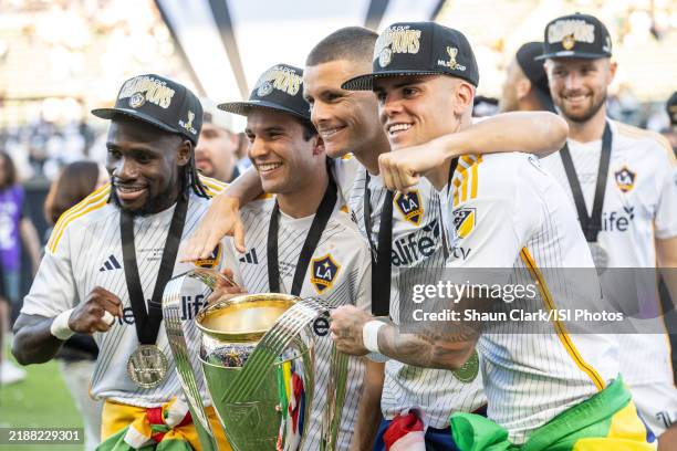 Joseph Paintsil #28; Riqui Puig #10; Dejan Jovelji #9 and Gabriel Pec #11 of Los Angeles Galaxy following the MLS Cup Final at Dignity Health Sports Park on December 7, 2024 in Carson, California. The Los Angeles Galaxy won the match 2-1 (Photo by Shaun Clark/ISI Photos/Getty Images)