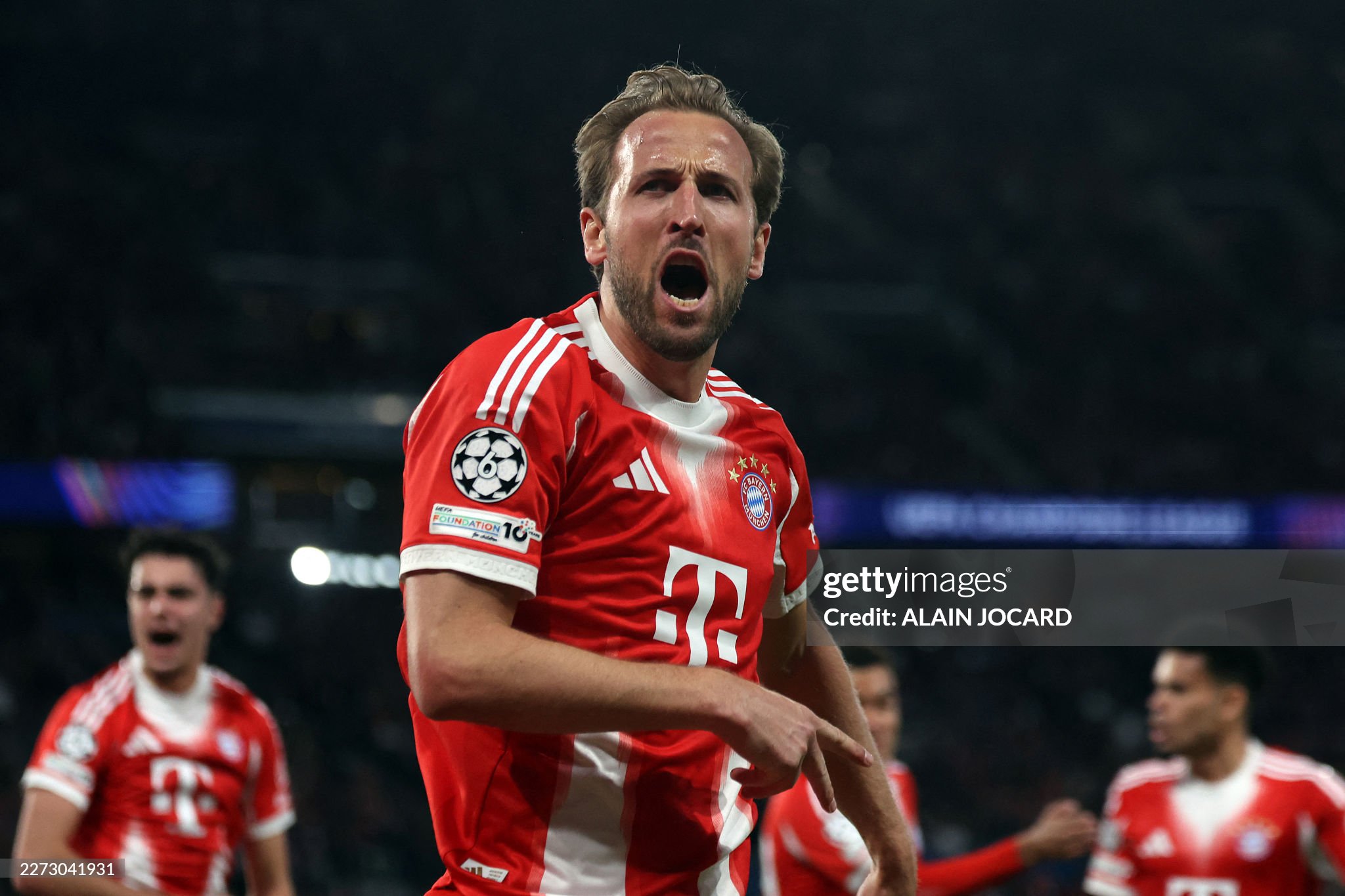 Bayern Munich's English forward #09 Harry Kane celebrates after scoring his team first goal during the UEFA Champions League semi-final first leg football match between Paris Saint-Germain (PSG) and Bayern Munich (Photo by ALAIN JOCARD / AFP via Getty Images)
