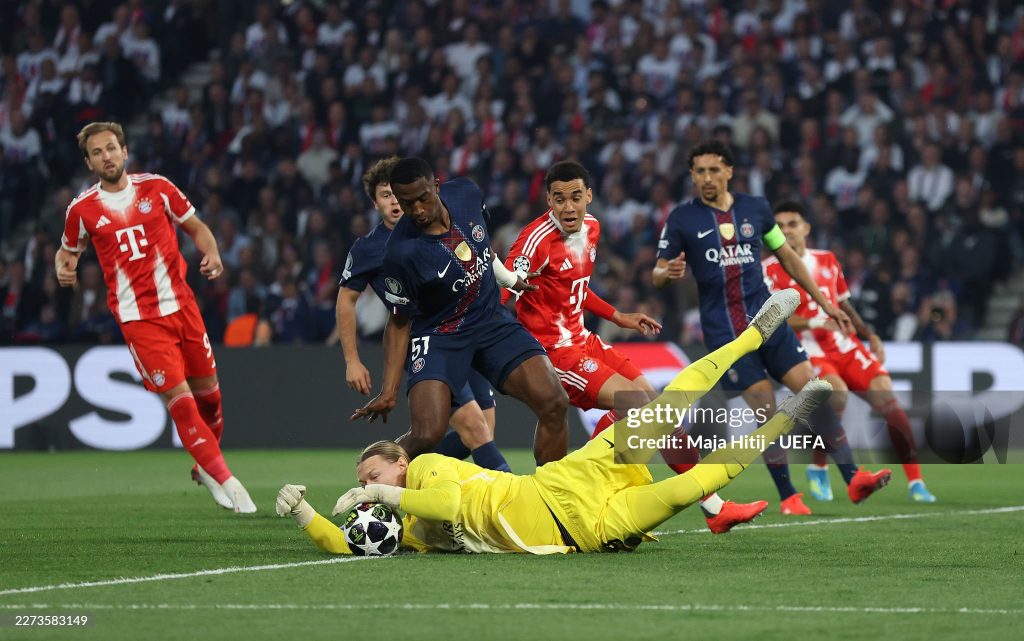 Matvey Safonov of Paris Saint-Germain saves the shot of William Pacho of Paris Saint-Germain during the UEFA Champions League 2025/26 Semi Final First Leg match between Paris Saint-Germain and FC Bayern München (Photo by Maja Hitij – UEFA/UEFA via Getty Images)