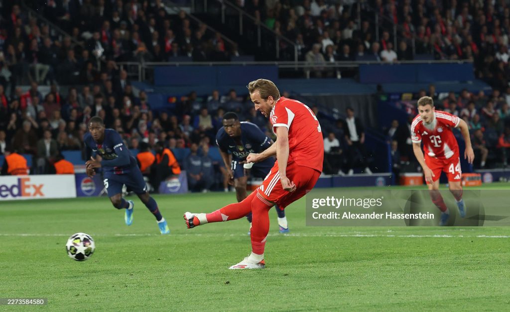 Harry Kane of FC Bayern Munich scores his team’s first goal from the penalty spot during the UEFA Champions League 2025/26 Semi Final First Leg match between Paris Saint-Germain and FC Bayern Munchen (Photo by Alexander Hassenstein/Getty Images)
